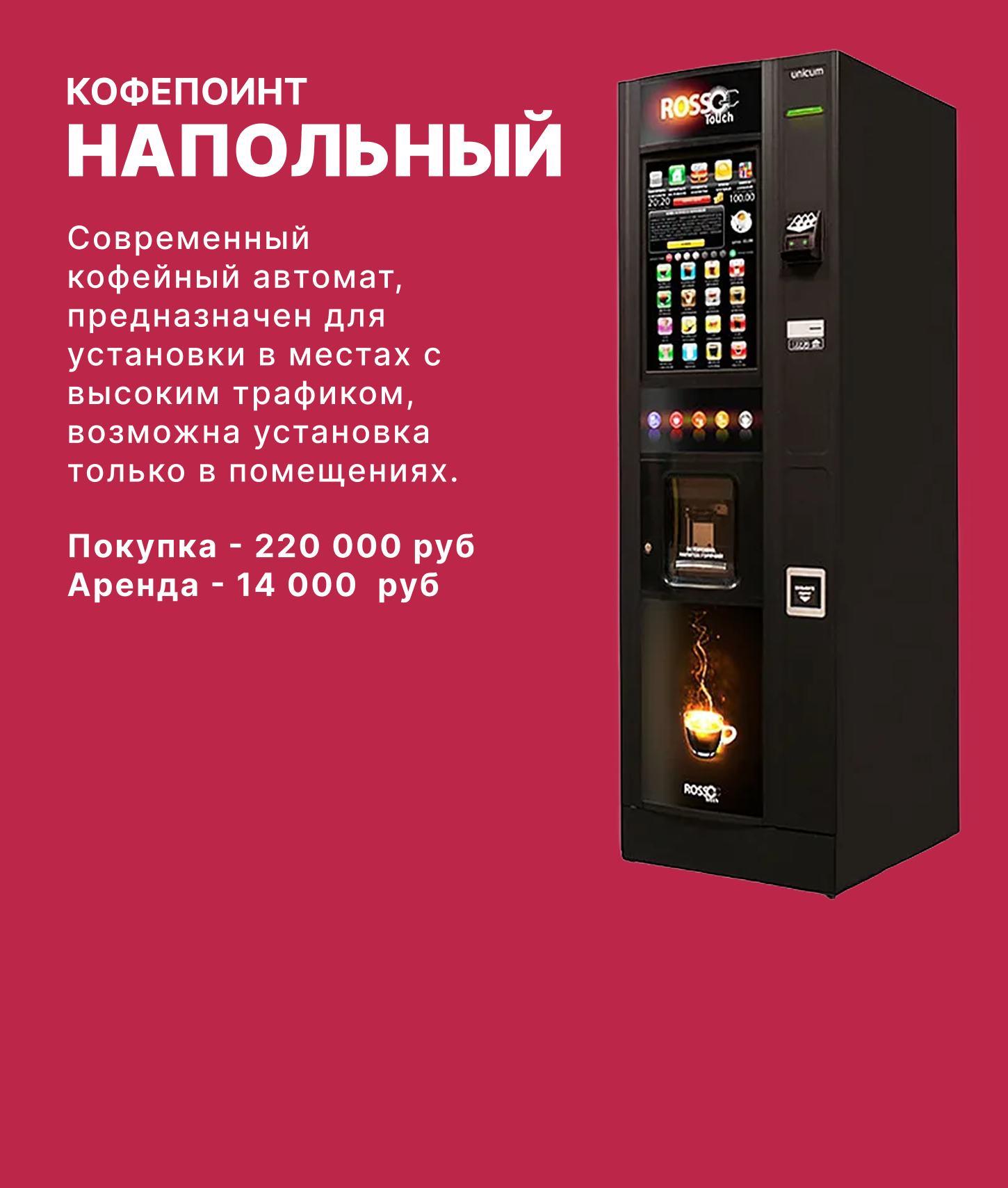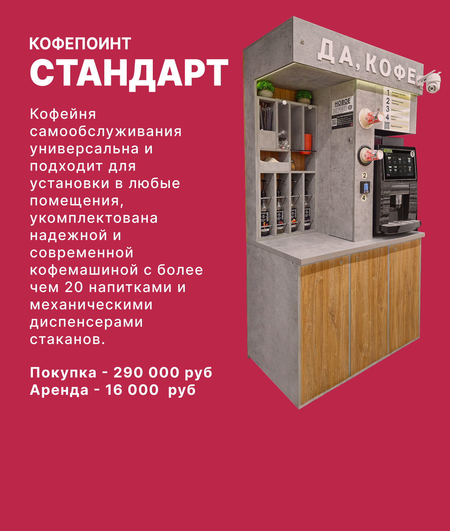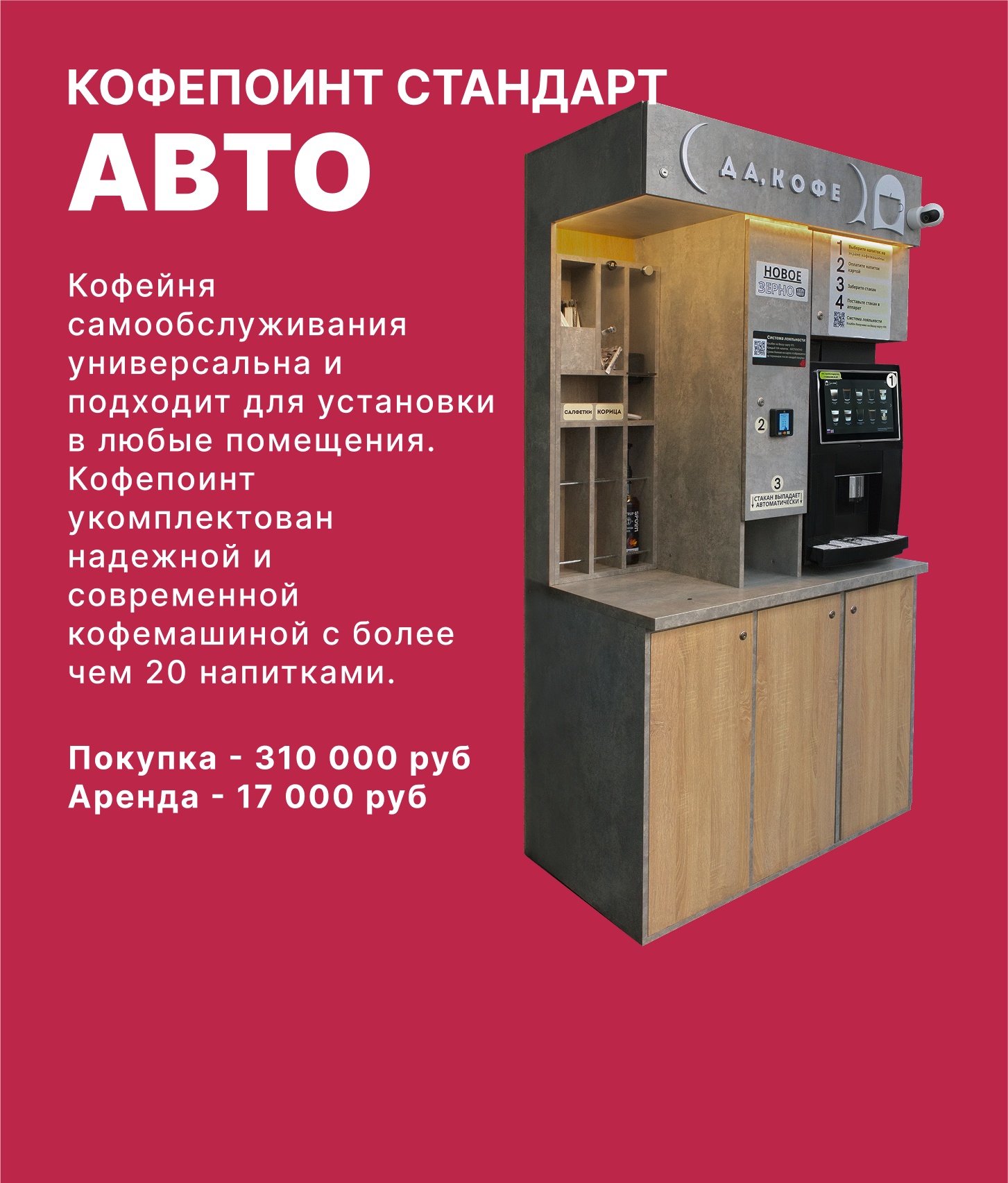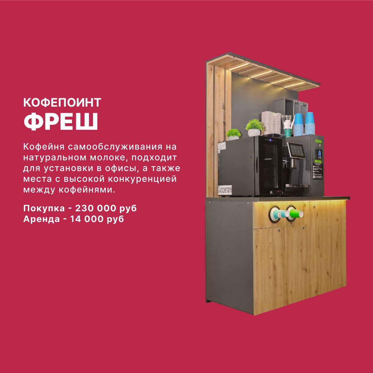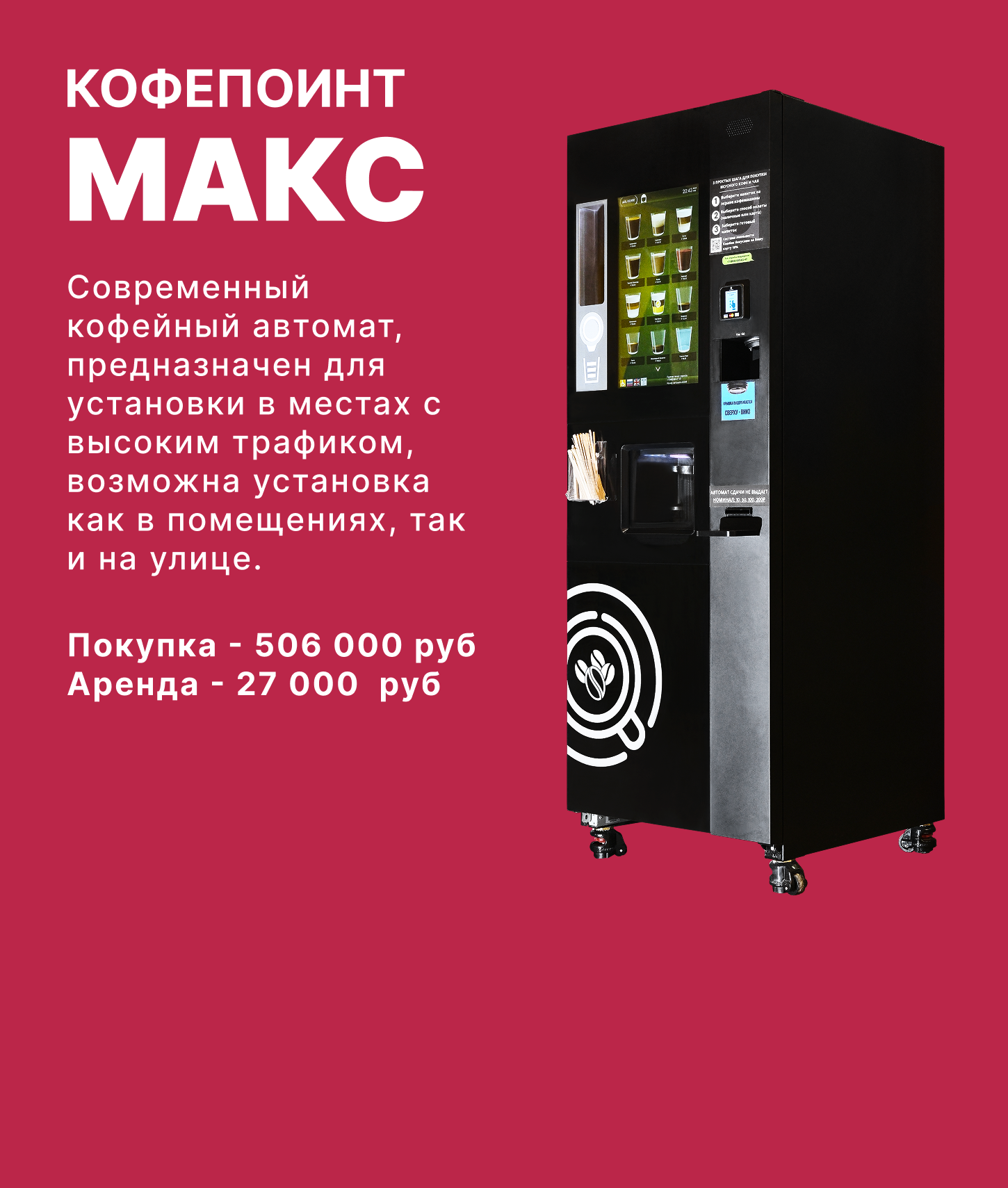 Наша компания специализируется на продаже, установке и обслуживании автоматизированных кофе-поинтов и микромаркетов самообслуживания.